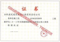 2013全國建筑裝飾行業(yè)科技示范工程獎(jiǎng)(池州金融大廈外幕墻裝飾)
